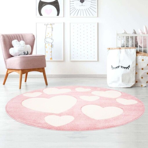 Kinderteppich Rund Herzen 3D – Rosa/Creme -36%